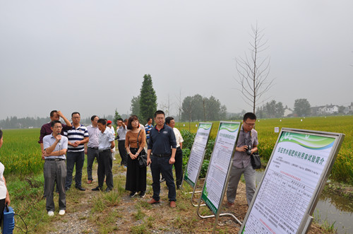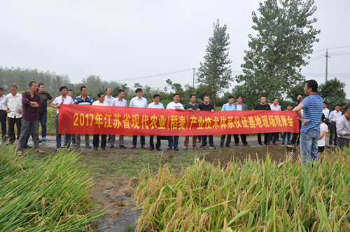 本次观摩活动参观了三个示范点:首先来到陈集丁桥绿色防控示范点,主要展示了诱虫灯和香根草等绿色防虫新技术、病虫统防统治与农户自己防治效果对比、科学使用农药和绿色防控结合--“稻之道”等技术措施。随后来到2017江苏省现代农业(稻麦)产业技术体系(仪征)推广示范基地。今年基地共示范种植22个水稻品种,其中籼稻14个,粳稻8个,同时开展了籼稻不同播量、不同播期、不同栽插密度的机播试验、粳稻不同播期机播试验和孕穗期硅肥试验等。最后来到稻田侧深施肥节本增效新集示范点,该示范点主要开展了测土配方施肥、水稻侧深施肥、有机肥替代化肥三个试验。