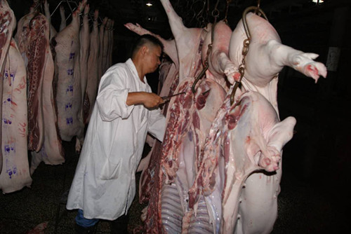 为保障国庆、中秋两节食品安全,确保城乡居民吃上“放心肉”,9月27日凌晨,市农委动物卫生监督所组织执法人员对真州生猪定点屠宰场进行监督检查,以进一步规范检疫行为、强化畜禽屠宰安全生产管理,确保上市猪肉质量安全。