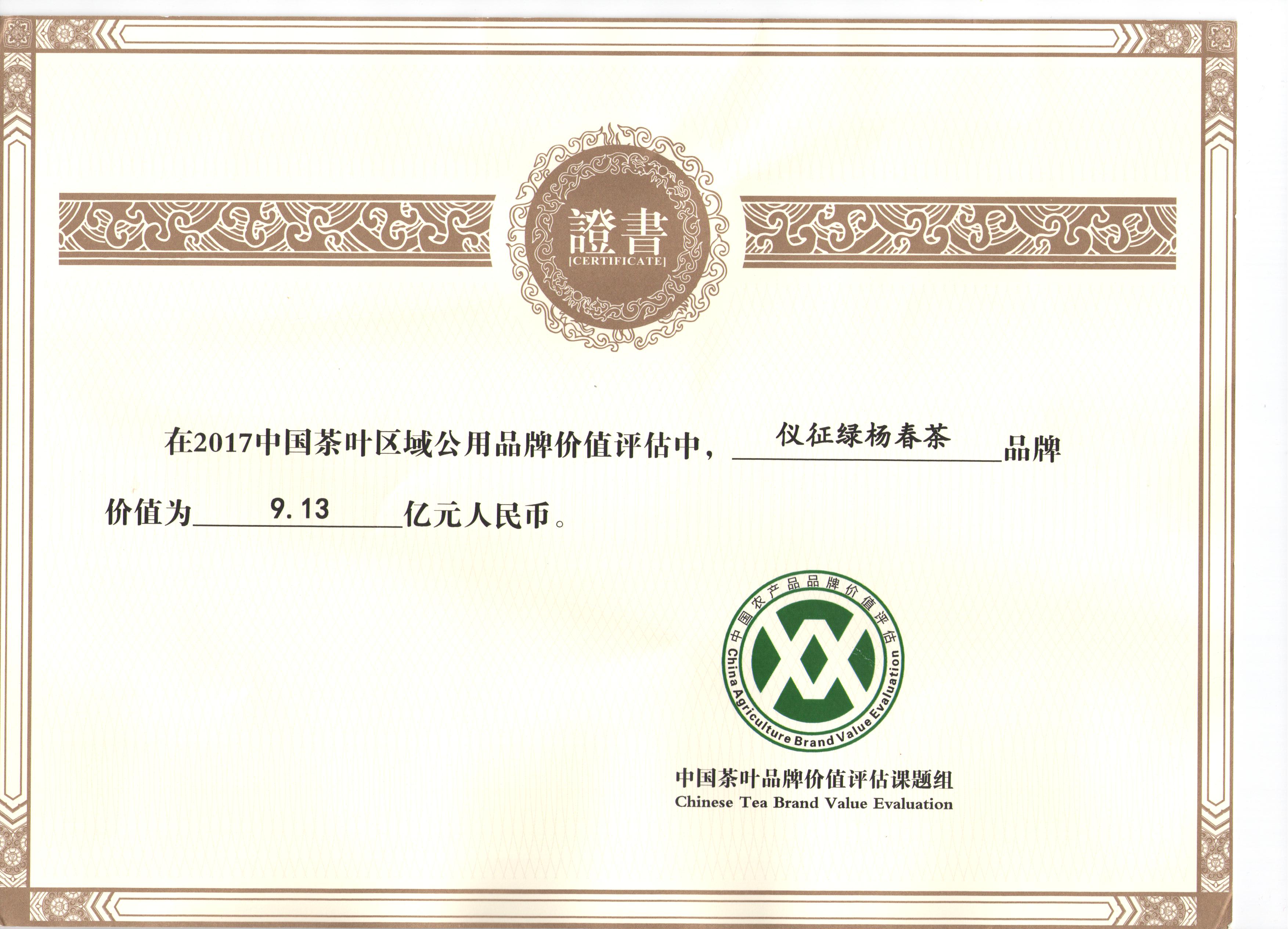 2017年中国茶叶区域公用品牌价值评估结果显示,仪征“绿杨春茶”品牌价值为9.13亿元,比上年度品牌价值7.89亿元上升了1.24亿元。