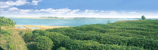 江苏省仪征市月塘茶场座落在扬州自然风景区登月湖泮,建于一九八二年,现有茶园二万多亩,三面环水,气候湿润,风景迷人,无任何污染。